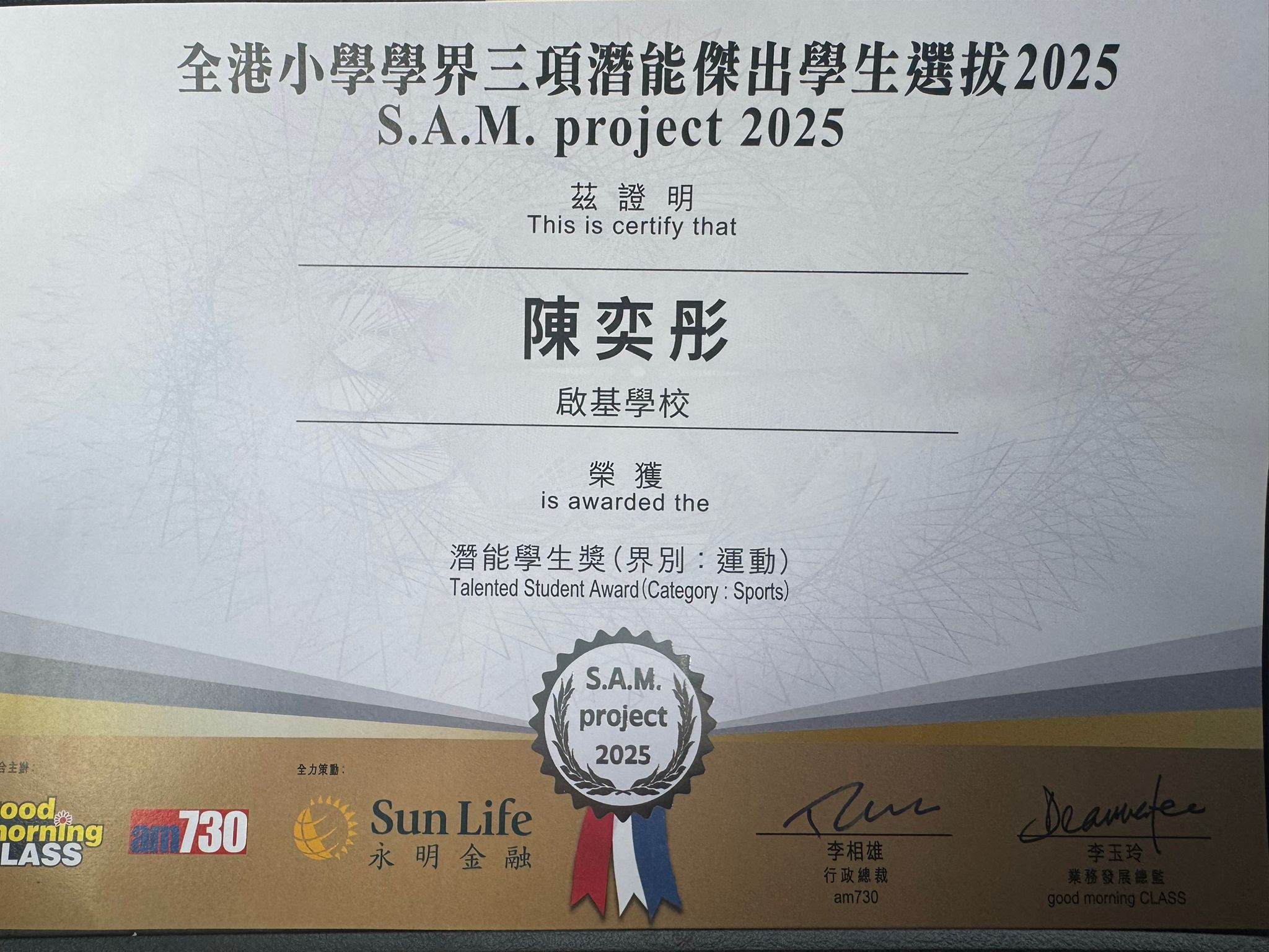 恭賀校友陳奕彤於「全港小學學界三項潛能傑出學生選拔2025」獲潛能學生獎